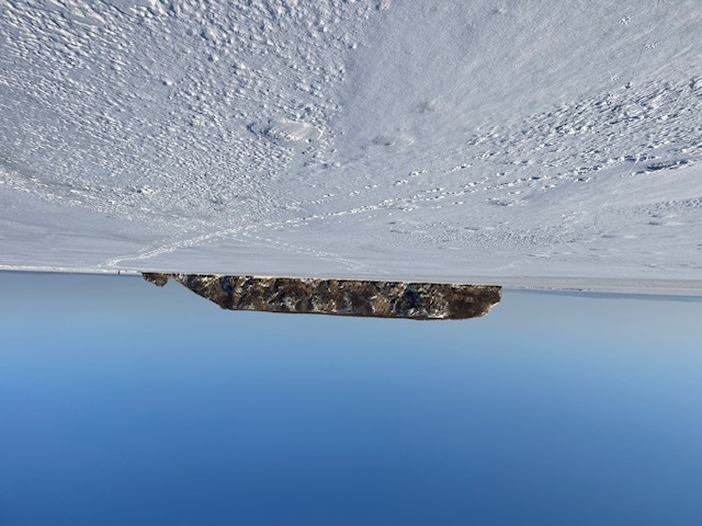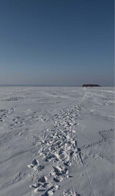 Итак, доехав до берега я отправился пешком по замерзшему заливу в сторону островка, примерно в паре километров от берега , у нас называющегося Коврижкой. Давно я мечтал дойти до коврижки, но всё никак мне это не удавалось. Погода солнечная, видимость миллион на миллион, температура -14, всё располагает к прогулке.