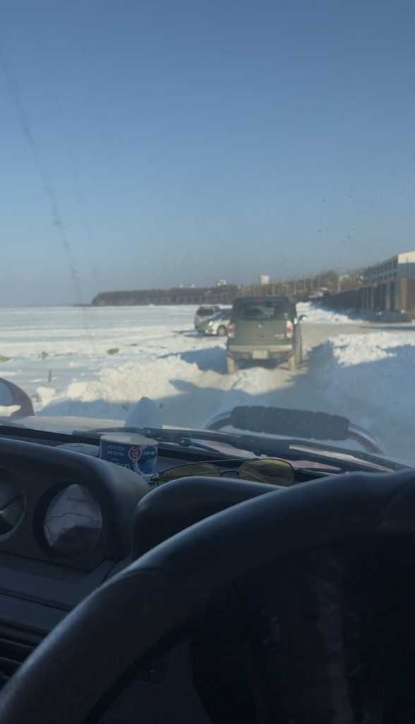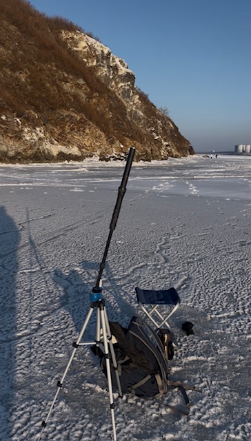 в 16 часов, за два часа до начала выдвинулся на позицию. Путь на машине до уреза воды занял не больше 5 минут, в теплое время года этот обычный путь пешком (с собачками на прогулку) занимает не более 10 минут в одну сторону, но сейчас машина будет местом отогревания после моего похода на "позицию".