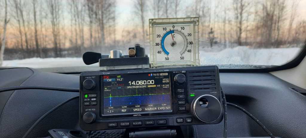 У нас в день игры было собрание РО СРР, поэтому, успел выехать на окраину города и развернуть антенну только к началу последнего часа. Т.к. я облюбовал место на въезде у автосервиса, который в выходной не работает, но всё равно кто-то мимо может проезжать, поэтому, для удобства использовал полноразмерный GP на рейлинге авто без противовеса. На рейлинге крепление антенны крепится через резину, но я недавно приобрел магнитную пластину для ёмкостного подключения кузова автомобиля в качестве земли. Настройка антенны сразу попала куда надо, КСВ 1.3. Сейчас я уже прочитал отчеты других участников и знаю, что прохождение было не очень, но в игре была мысль, что немного слабовато слышу, возможно из-за ёмкостной земли. Провел 8 связей, к сожалению QSO с R4NCU/P до конца не состоялось из-за QSB. Был рад провести CW QSO с R1BBG, для меня стало большим сюрпризом, что недавно он выучил Морзянку, поэтому, его, как любителя работы в эфире из полевых условий, пригласил принять участие в МКН. Не знаю, напишет ли он отчёт, у него был Elecraft KX1 на батарейках с 1.5Вт на выходе и антенна луч 7м. Замерзнуть за час не успел, в машине с выключенной печкой было -5, на улице -19 с ветром. Читаю, что у некоторых ноги подмерзли, у меня закуплены на Озоне химические грелки для пальцев ног, но не пригодились.
