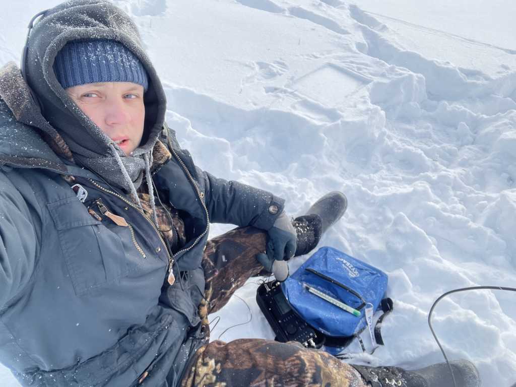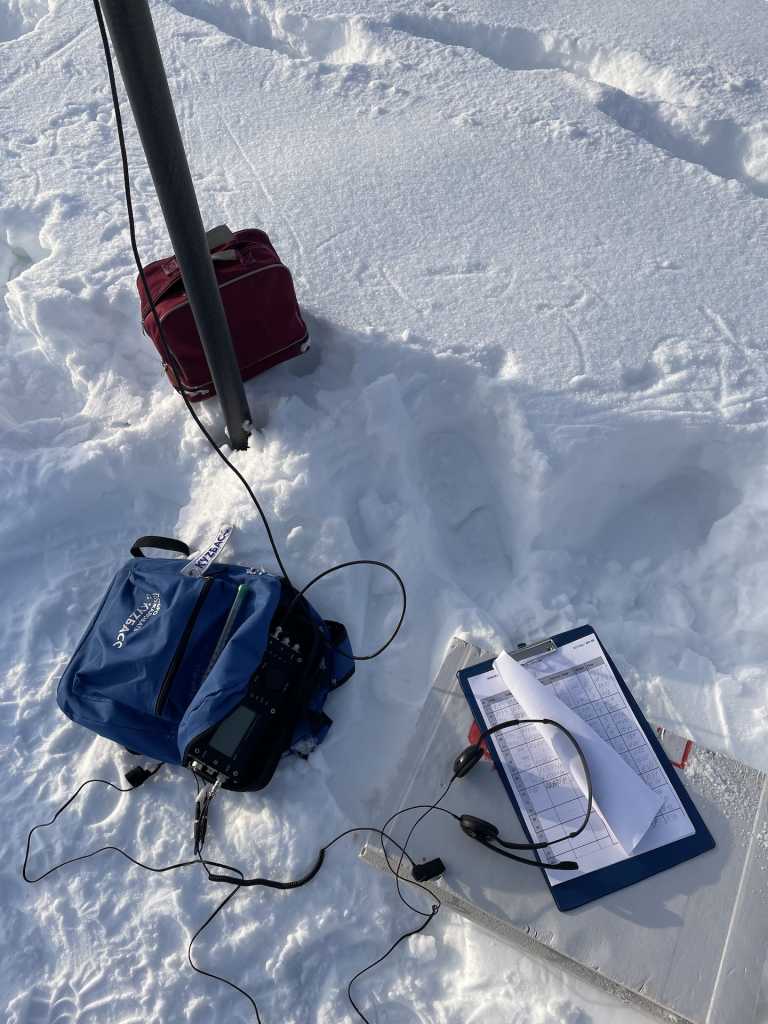 Ветра не было и не предвиделось, поэтому решил расположиться в чистом поле, хотя забрался и не далеко (без лыж перемещения давалось тяжело). На позиции был в 9:00 МСК, до начала соревнований целый час. Вся подготовка у меня выливается в установку антенны.