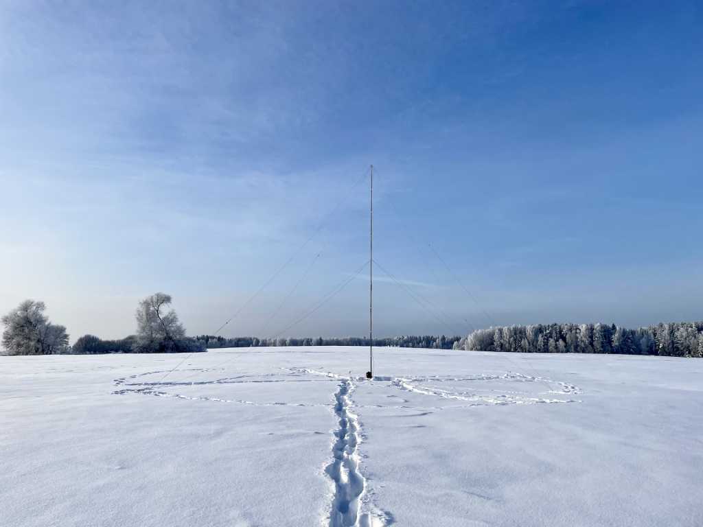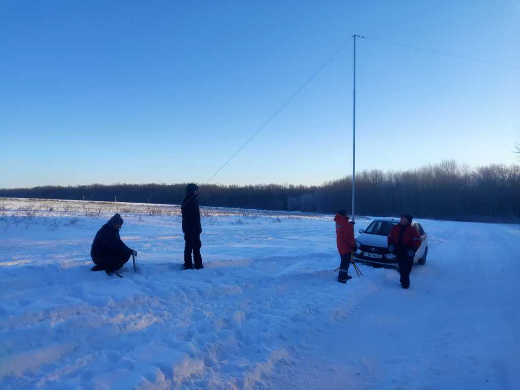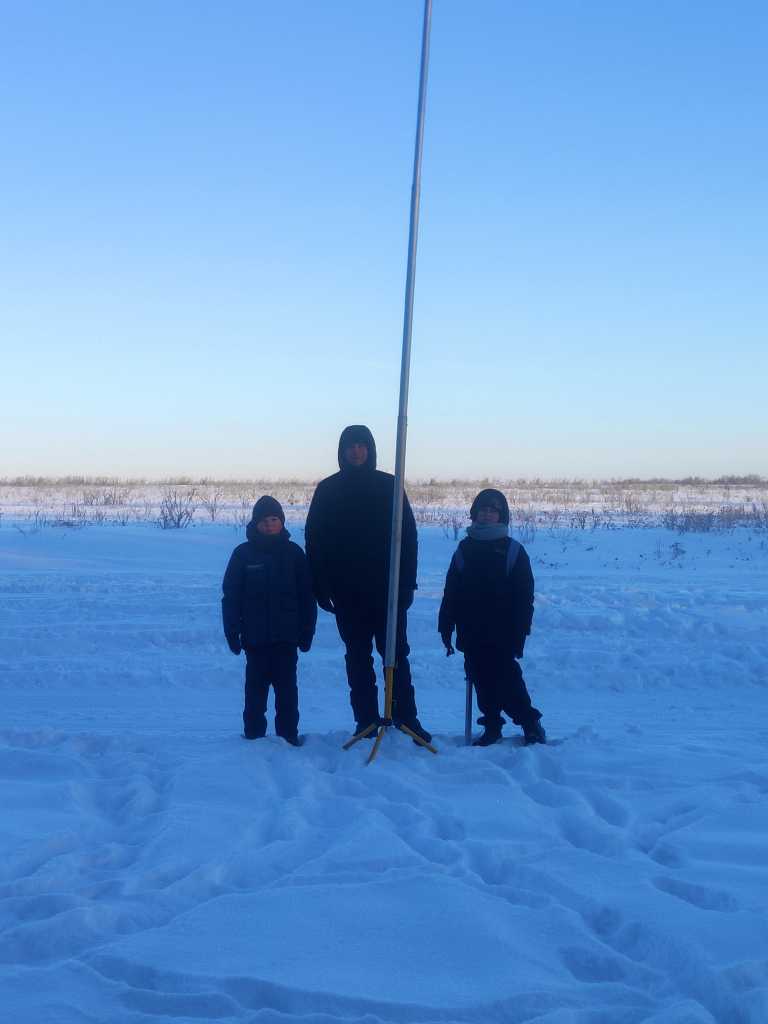 Ставить китайскую 13м мачту в одного было не удобно, т.к. снег был очень пушистым и рассыпчатым, воткнутая на полметра мачта в нём держалась только в сложенном стояние. Крепления для оттяжек на самой мачте я так и не сделал, поэтому всё привязывалось на месте узелками, что отняло много времени. Со стороны земли оттяжки крепились к “плавучему якорю” в виде обрезков от вагонки. В качестве антенны использовал IV-40-20, мачту выдвинул только на 10м (даже меньше), т.к. у меня есть только 10м RG-58. На установку антенны ушёл почти час.