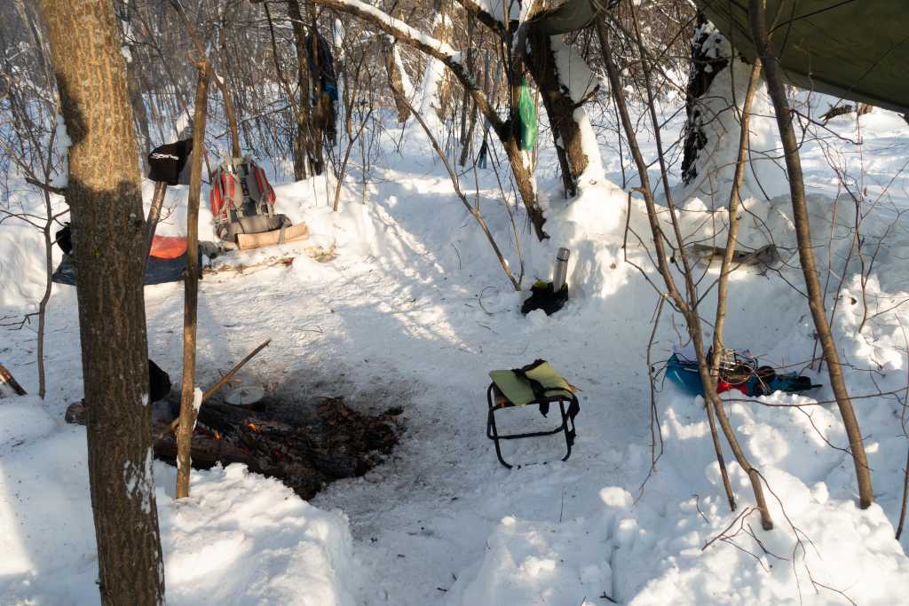 Вот и день соревнования. Подъем в 7 утра на градуснике -18С собираю бутерброды, термос, пакую все это в рюкзак с аппаратурой и одеждой и выхожу около девяти часов, температура еще понизилась до -20С, иду до леса там лыжи, еще полтора км до поляны. На месте быстро переодеваюсь в теплую одежду и переобуваюсь. Натягиваю тент и подвешиваю антенну. Все равно очень холодно - нужен костер. И тут я понимаю, что сосна сильно промерзала и зажечь ее - надо сильно постараться, спасает щепа из гаража – и первый час пока не разгорелись дрова она меня грела. При этом меня подвели мои часы – они перестали показывать температуру. Потом после нескольких фоток стал дурить фотоаппарат – техника не выдерживает. Стол, сделанный из снега, оказался от костра далековато пришлось передвигаться ближе. Первый час игры прошел скомкано. То костер подправить, то позицию передвинуть. Да и активность не очень. Как показывает практика – лучше сразу работать на одном диапазоне, а не прыгать по частотам – сильно теряется время. Работаю телефоном на 40метров, в антенну уходит около 10 Ватт, батарея и аппарат на морозе молодцы, работают исправно. С прогревом костра прогревается и диапазон – очень хорошо идет первый район несколько станций гремят (собственно основная работа с ними). Хорошо идет коллективная станция RW3E/P ребята работают из полевых условий – Молодцы. Третий час пролетел мгновенно – такое ощущение, что его сократили в два раза. Начали подходить местные станции отработал с Владом RX3ALL – громко и уверенно (собственно, как и всегда). Не успеваю записывать раппорта. Все 14 часов МСК – соревнования закончились, а я только разогрелся. Решил сделать перерыв- заварить кофе из снега и пообедать. День прекрасен температура поднялась до -8С, костер только разгорелся как следует. Обедаю и слушаю 20 метров прохождение нормальное, идет тест, много зарубежных станций. После обеда решил поработать на общий вызов. Сразу стал подходить шестой район – многие дают раппорта с хорошими плюсами - не верят что работаю 10 Ваттами в антенне. Хотя чему удивляться – антенна основными лепестками смотрит север-юг, а для 20М шестой район как раз будет первым скачком. Отработал несколько связей и надо собираться время начало четвертого, а зимний день короток и солнце уже склонилось к горизонту, да и температура опять покатилась вниз. Не спеша собираюсь – снимаю антенну (оттяжки оставил, может еще выберусь), снял тент (хорошая вещь: тепловой экран-отражатель и защита от снега), упаковываю все, переобуваюсь и в сумерках уже выбираюсь из леса. День пролетел очень быстро.