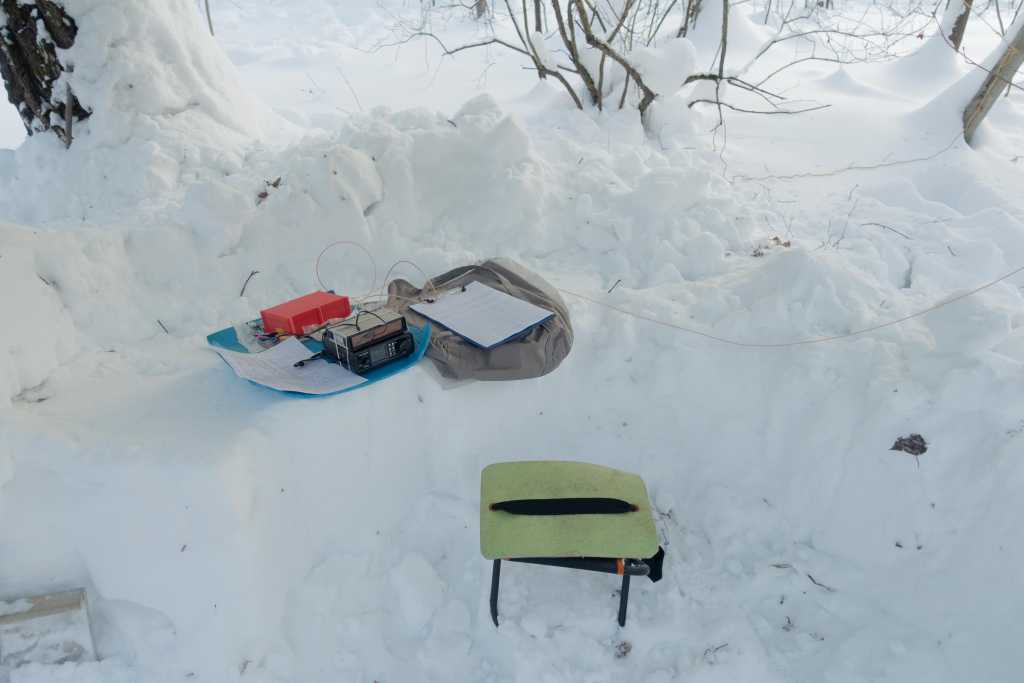 Забросил проволочную антенну почти вертикально и противовес развернул прямо по снегу куда-то в восточную сторону  . Прохождение было мягко говоря не очень, работу начал около 12 мск, диапазон 20м. Громких станций практически не было, станции проходили с глубокими замираниями до полного пропадания сигнала. Но все таки удалось провести несколько связей!