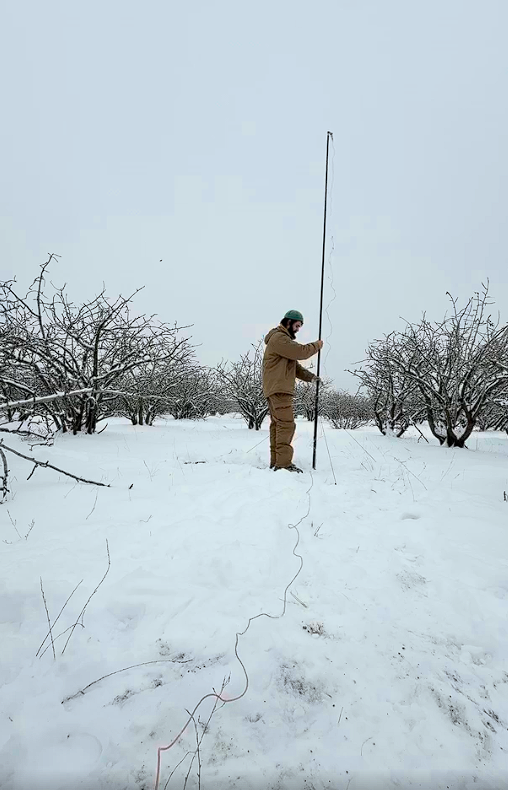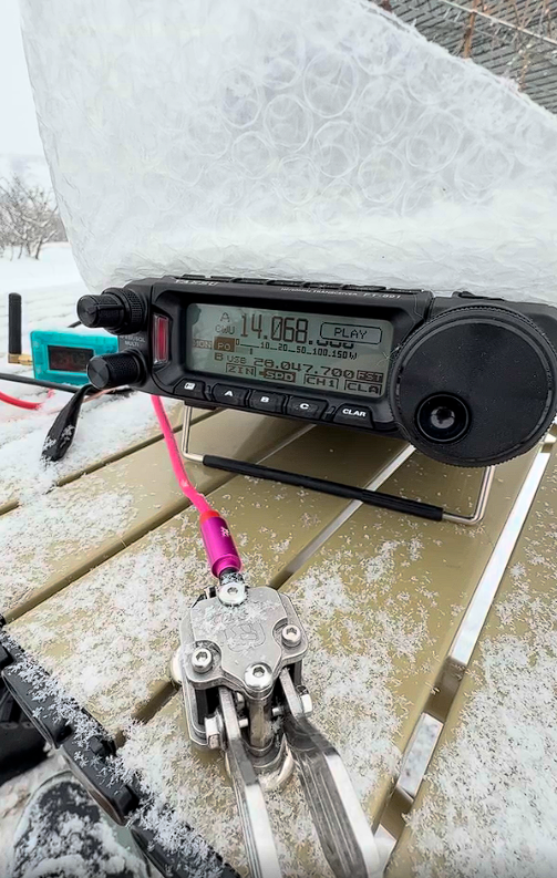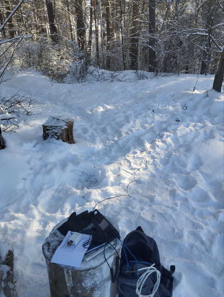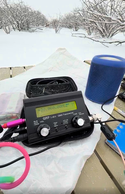 Поработать в контест-игре «Мороз Красный Нос 2026» вышло спонтанно. Летом присмотрел неплохое местечко на окраине леса (KO52PK), но испытать его как-то не довелось. И вот вооружившись китайской копией M0NKA, аккумулятор 12 Ah, кусок провода, длинной около 20 м, трансфрматором 1:49 пошел в лес. Снега в этом году выпало очень много, вид очень красивый, деревья в снежных шапках, ясное небо, класс!