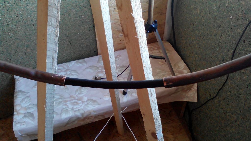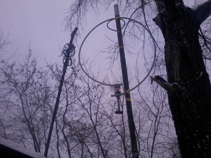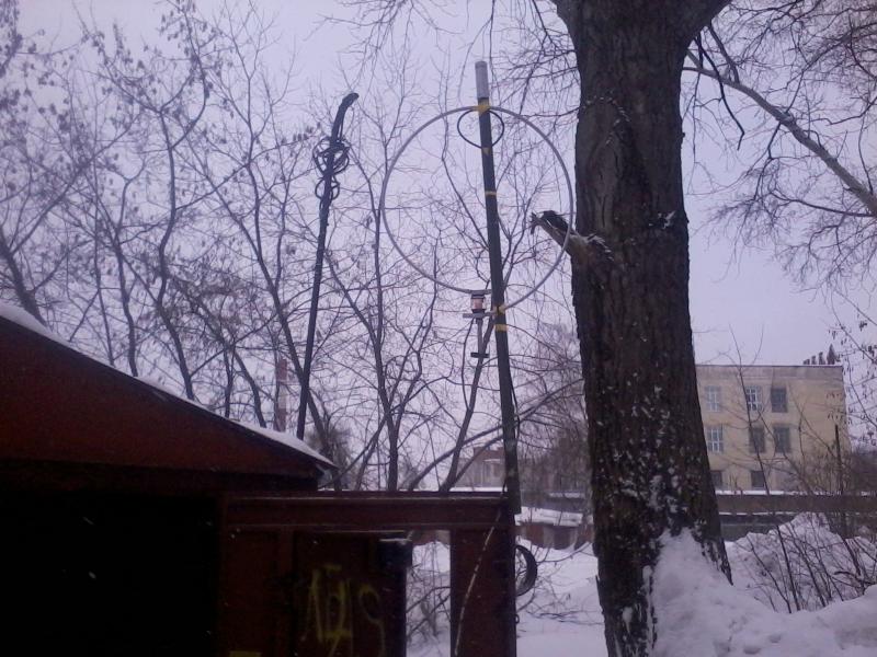 за основу был взят обычный гимнастический обруч диаметром 1м, но с заделкой на кпе диаметр получился примерно 80см. кпе вакуумный до 200пФ. данная конструкция подключена через петлю связи из 50-омного кабеля. антенна установлена на деревянную палку, которая в свою очередь была установлена на дверцу гаража. конструкция настраивалась и опробована на всех радиолюбительских диаппазонах от 40м до 10м (в том числе и warc). экспериментальным путем получены представления о ярко выраженной дн в виде восьмерки.