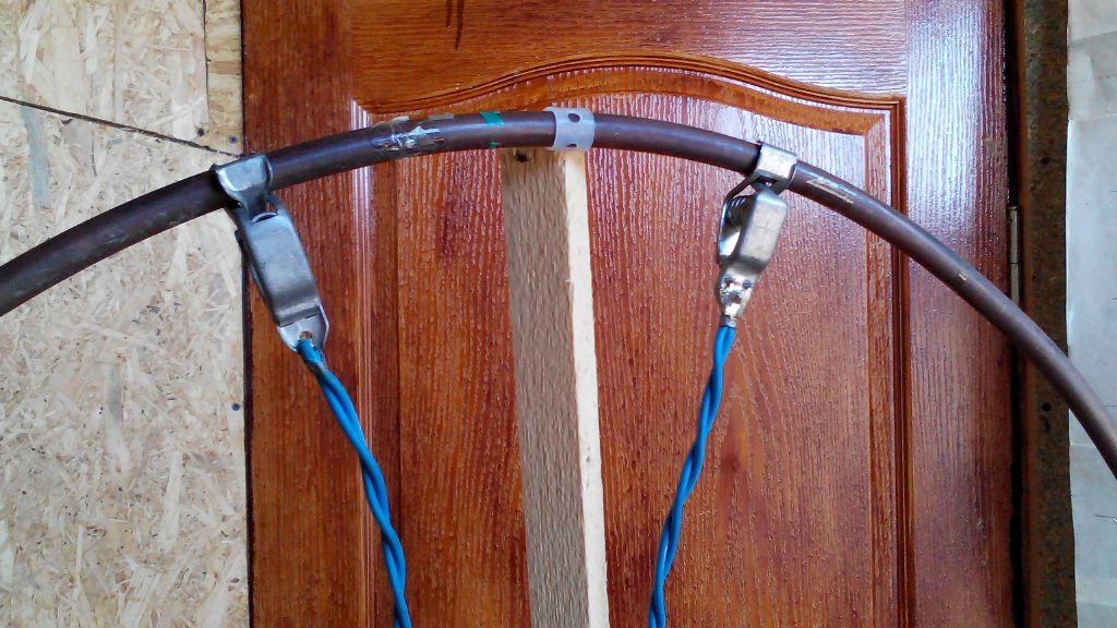 как видно на фотографиях из предыдущего поста, к конденсатору подключена медная центральная жила от свч-кабеля (кусок кабеля сотовой компании с оплеткой диаметром 17мм, который очищен от изолирующего наружного слоя, так как он вносит значительные затухания).
