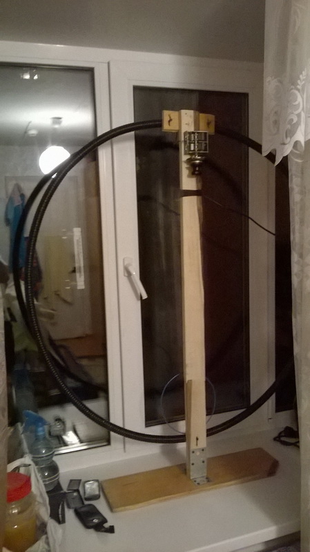 До этого в качестве рамки использовалась гофра от сотового кабеля, а в качестве петли согласования - из куска кабеля РК-50. Сейчас же используется внутрениий проводник кабеля, а в качестве петли кабеля петлю из проволоки диаметром меньше в 5 раз самой рамки. Гофру обмотал изолентой.