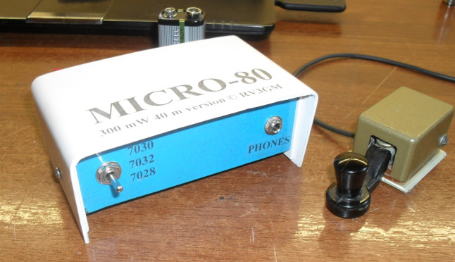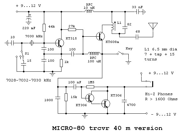 А вдруг кому-то будет интересно и возникнет желание повторить! На днях собирал и возился с настройкой Микро-40 по классической схеме с УНЧ на двух транзисторах и высокоомными наушниками. Удалось выжать 300 мВт на 40 м. Чистый кварц 7030 генерирует на 7028 кГц. В данной схеме емкостной трехточки кварцы всегда генерируют чуть ниже своей частоты. Вместо КПЕ для толкания частоты использовал пару постоянных кондеров и тумблер с нейтральным положением. В итоге получилось три частоты 7028-7030-7032 кГц. При некотором навыке легко можно обходиться и без специальной схемы сдвига частоты при передаче. Пришлось добавить ВЧ дроссель в цепь питания транзистора РА, ибо при резонансе LC возникало самовозбуждение каскада. Резистор в базе транзистора генератора 44 кОм составлен из двух по 22 кОм, подбирал по максимуму ВЧ на выходе. Емкость в эмиттере РА 1800 пФ подбиралась по максимуму громкости в наушниках. Совсем без этой емкости нельзя, возникает возбуд УНЧ по ультразвуку. Катушка имеет ферритовый подстроечник. Емкость в контуре подбиралась под нагрузку 50 Ом.