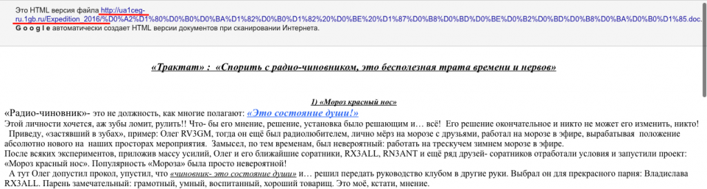 В наше время даже первоклашкам вдалбливают, что их следы пребывания во всемирной сети остаются там практически навечно. В прилагаемом файле HTML, сохранённая веб-страничка сайта ua1ceg, раздел экспедиций 2016 года, которую Юрий быстренько удалил со своего сайта. Любой желающий может посмотреть адрес страницы, а также её код, в шапке которого отображается адрес исходного сайта.