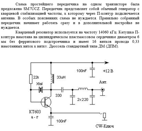 И сколько получилась выходная мощность ???? меряли ???? У меня тоже стоит кт-603 и если менять сопротивление в цепи эмитера то мощу можно регулировать от 60 мват до 300 примерно . Сейчас хочу поставить туда переменное сопротивление что бы можно было оперативно менять мощу в данный момент стоит 100 Ом и на выходе примерно 90-100 миливат .ПИ контур у меня получился Г образный тоесть на горячем конце кондер на корпус около 60 пик потом катушка ПИ КОНТУРА И В ант на холодном конце кондера нет , так уж настроился мой штырек 5 метров. Пробовал подключать диполь и сразу КСВ выскакивает . Радиосвязей пока тоже нет но скимеры слышат сейчас все питаю от аккумулятора от шуроповерта как только поставлю туда КРОНУ 9 вольт питать буду от нее естественно моща упадет вот переменником ее и подгоню до нужного уровня .На прием если в поле пока применять хочу ДЕГЕН в итоге надо будет мастерить ППП