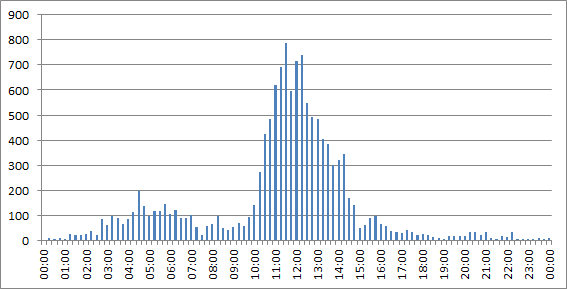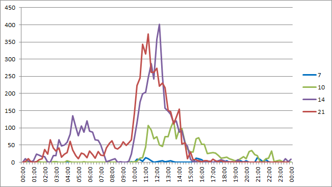 Видно, что в основном Океания принимается тут в Алматы на закате. Действительно, вот распределение по часам приёма (UTC):