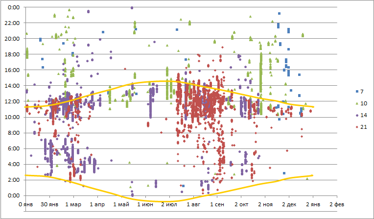 Сразу - карта "день-час" за два года: