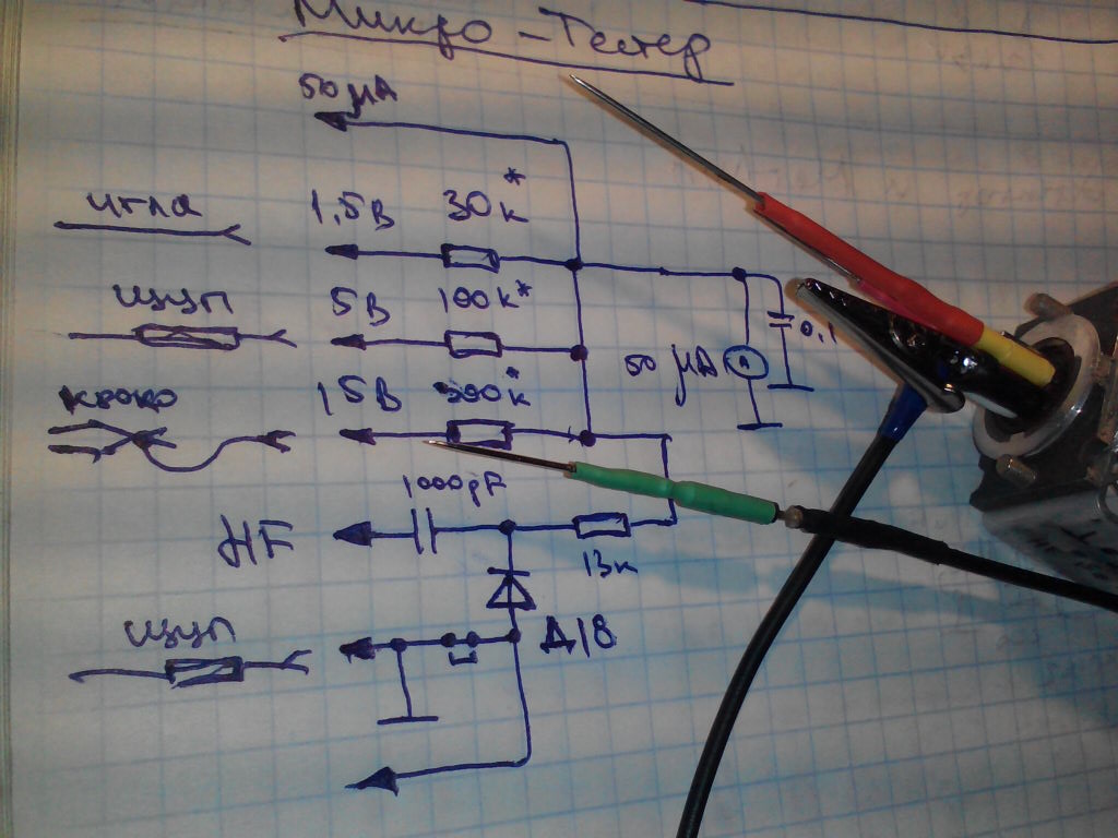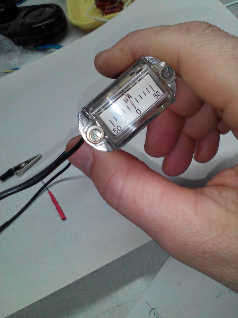Конструкция достойная начинающего радиокружковца, но лучше поздно чем как всегда. Хотелось тестер, чтоб маленький и в руке лежал, для оперативных оценочных работ, и иголочки, дабы проникали в труднодоступные места микроплат одновольтовой техники. И был индикатор очень симпатичный - подарен одним старым феодосийским радиолюбителем. А то что двуполярный, для аналогового тестера самое оно - полярность не нужно соблюдать.