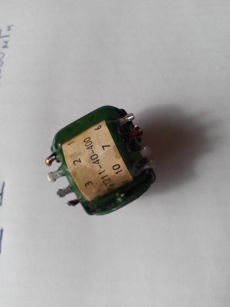 ВОт трансформатор, который мне наиболее понравился, в нем кольцо зеленого цвета с проницаемостью ориентировочно 10000. Обратите внимание, что вторичная обмотка, работающая на наушники имеет всего 14 витков!