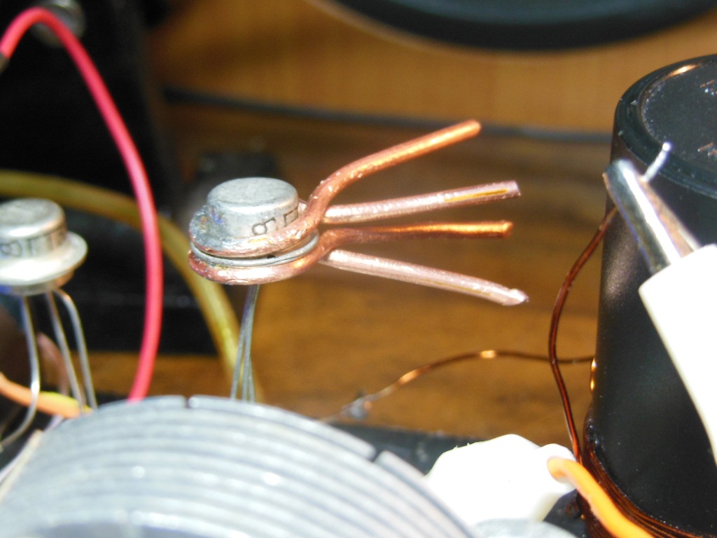 Заметил, что при ключевании МП20 открывается не полностью. Заменил его на тот же ГТ321. Рабочий транзистор стал в ответ греться и генерация срывается посередь 5-минутного сеанса. Стал экспериментировать с радиаторами. За неимением подходящих радиаторов сделал "спутниковый" концепт-радиатор: