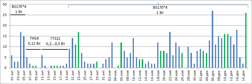 Зелёным выделены выходные - я проверял гипотезу, что во время контестов сигнал маячка забивается другими станциями. Похоже, гипотеза не подтверждается.