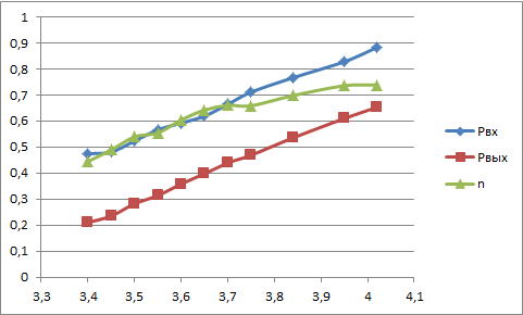 В полевой стационарной (висячей) конструкции 5 В взять особо неоткуда, поэтому думаю вернуться к питанию 3,7 В. Провёл измерения, как меняется мощность/КПД от изменения напряжения питания в диапазоне работы банки Li-Ion (3.4...4.1). Получается так:
