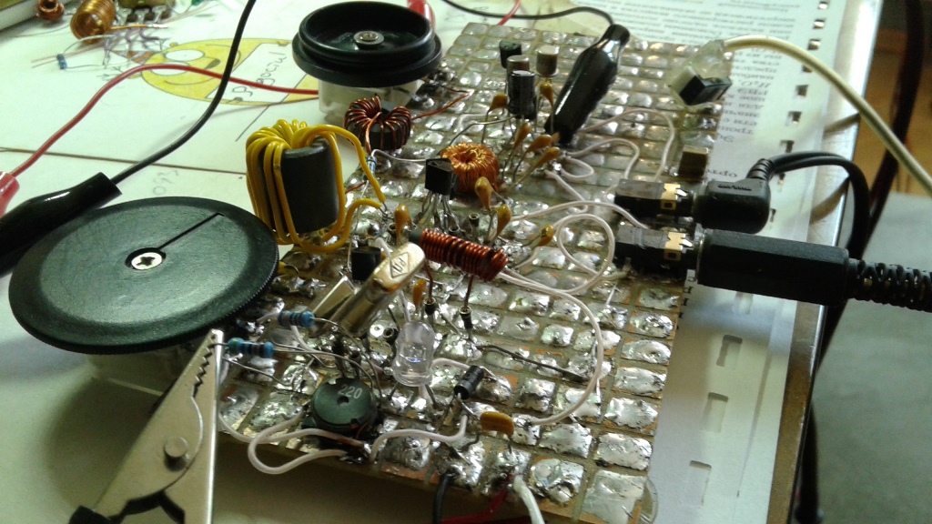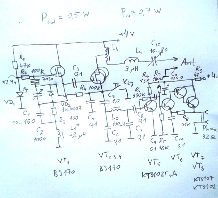 Пришло время и я таки сделал трансивер. За основу взята схема передатчика Виталика UI7K с моими доработками, которая у меня активно используется в маячках. Исходная схема тут. 4 полевика BS170, питание 4 В, пол-ватта на выходе. Собственно, доработка - это взять уже готовую и многократно проверенную схему УНЧ под низкоомные наушники и через ФНЧ присоединить к выходному тройному BS170 как смесителю. Всё как в лучших примерах Микро, Пикси и т.д.