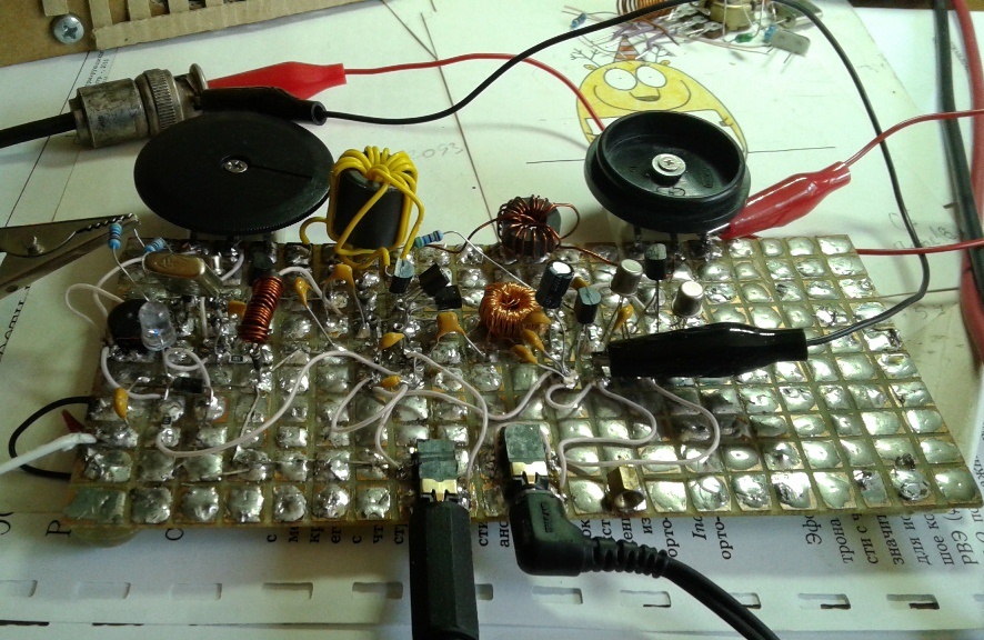 Еще одна особенность: диапазон перестройки частоты невелик - около 600 Гц всего, это при двух запараллеленных кварцах (русско-китайская дружба, кварцы разнородные). Пока не разобрался, как совместить дроссель и диод в схеме перестройки частоты. Смещение частоты при передаче составляет около 400 Гц убиранием напряжения с диода. Забавно, что напряжение на истоке выходного каскада (смесителя) при отпущенном ключе (на приёме) равно напряжению питания.