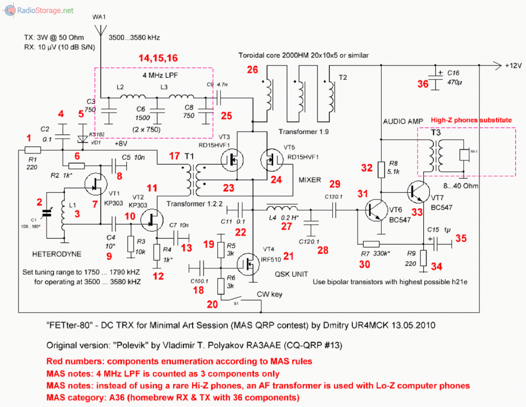 Ну никак не могу понять - а чего вы оба маетесь в поисках непонятно кем предложенных "горбатых" схем?! Ведь среди нас находится скромный, но очень талантливый конструктор и Радист Дима, UR4MCK. Самой простой его разработкой стала доведенная до уровня готового изделия идея Тимофеича под названием "Полевик". Вот полностью рабочая схема, даже с проставленными номерами деталей по критерию минималистического контеста MAS:
