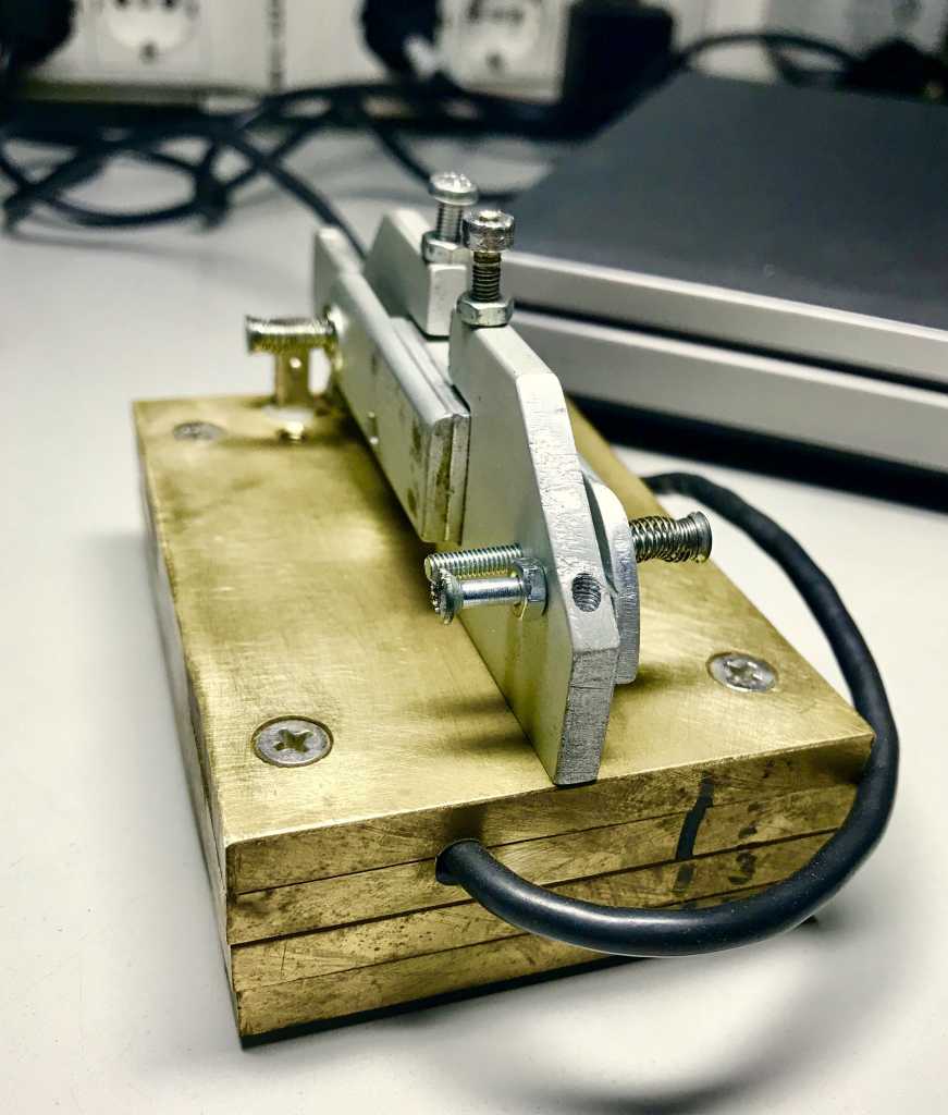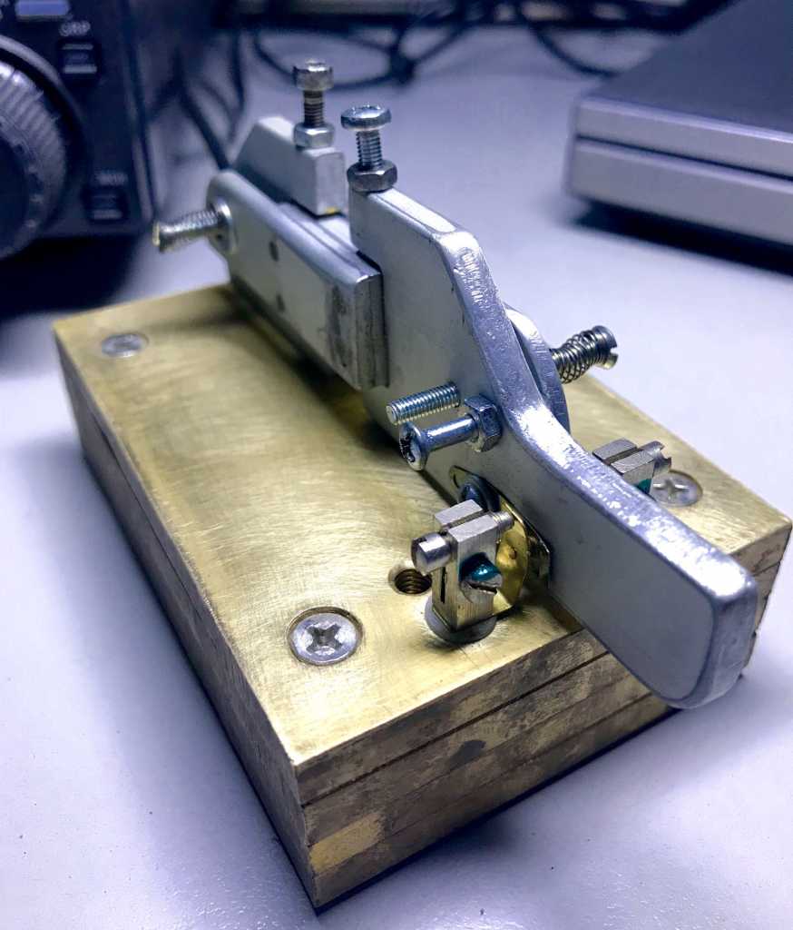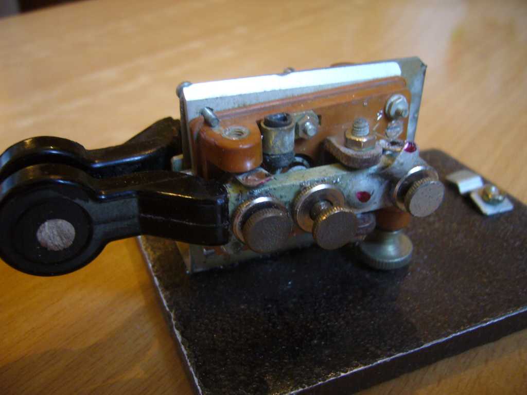Манипулятор самодельный из кусочков уголка 40мм и изогнутой в швеллер пластины 2мм. Подвеска рычагов на заостренных винтах. Контакты посеребренные от пускателей. Схема ключа из "Радио" за 1954 год. Корпус ключа от балластного дросселя ДРЛ.