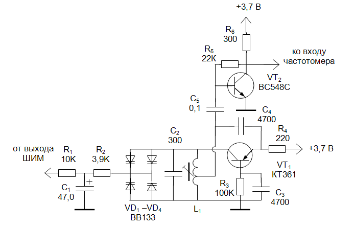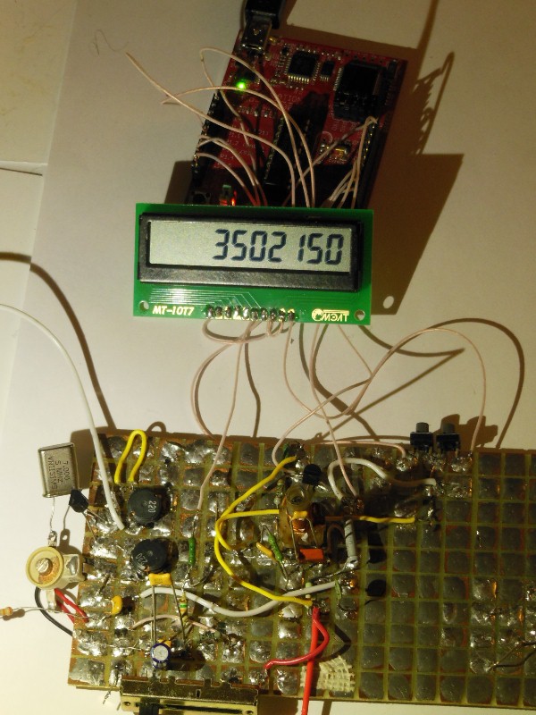 Давно мечтал скрестить микроконтроллер и простейший ГПД на одном транзисторе. Чтобы МК считал частоту гетеродина, а потом и корректировал её - меняя напряжение на варикапе в контуре. Получился, как ни странно, синтезатор частоты :blush: .