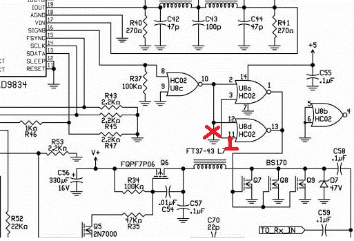 По передатчику - BS-170 полностью закрыты по приему! Смотрите схему, в ней к стати очевидная ошибка, как и в большинстве документации к самоделкам  . На входе OutBit AD9834 во время приема ничего нет. НС02 работает в этой схеме не как логический элемент, а смещен резистором R37 в режим линейного услителя. На выходе параллельных элементов 1 и 13(своеобразный усилитель класса D) тоже ничего нет. При нуле на затворе BS170 он наглухо закрыт. С переходом на передачу подачей манипуляции с контроллера, в АД-шке срабатывает компаратор и на OutB появляется сигнал с рабочей частотой(на Iout частота Fраб - ПЧ), который усиливается HC02 и подается на затворы BS170. Чуть раньше на транзисторы подается питание через мощный ключ FQP. Благодаря такой последовательности обеспечивается колоколобразная форма посылок и телеграф у ПФР мягкий, без щелчков.