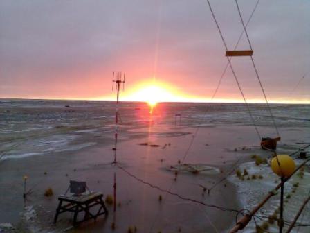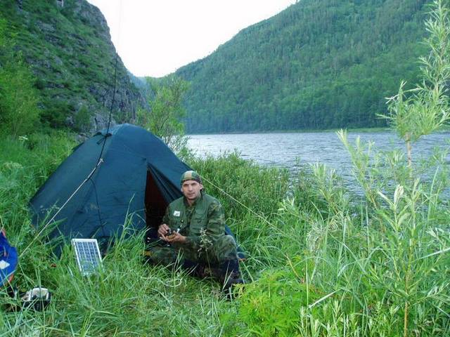 Работал на 20 метрах,антенна INV V на удочке 7 метров. Передачик с фиксированной частотой 5w, питание от солнечной батареи,ее видно на фото. Было проведено несколько связей с Примоским краем,Хакассией и Японией. Потом помешал телеграфный тест, а потом аппаратура побывала в воде.